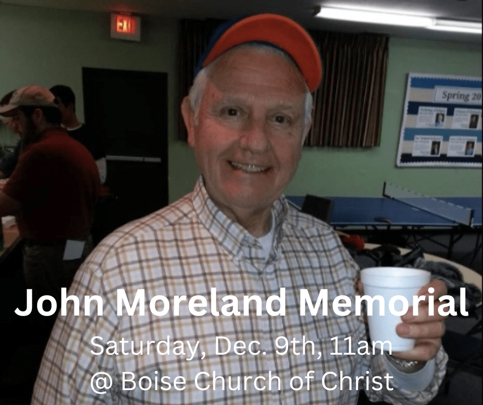 The memorial for John Moreland will be on Saturday, Dec. 9, 2023 at 11:00am at Boise Church of Christ. Lunch and visitation to follow. All are welcome.